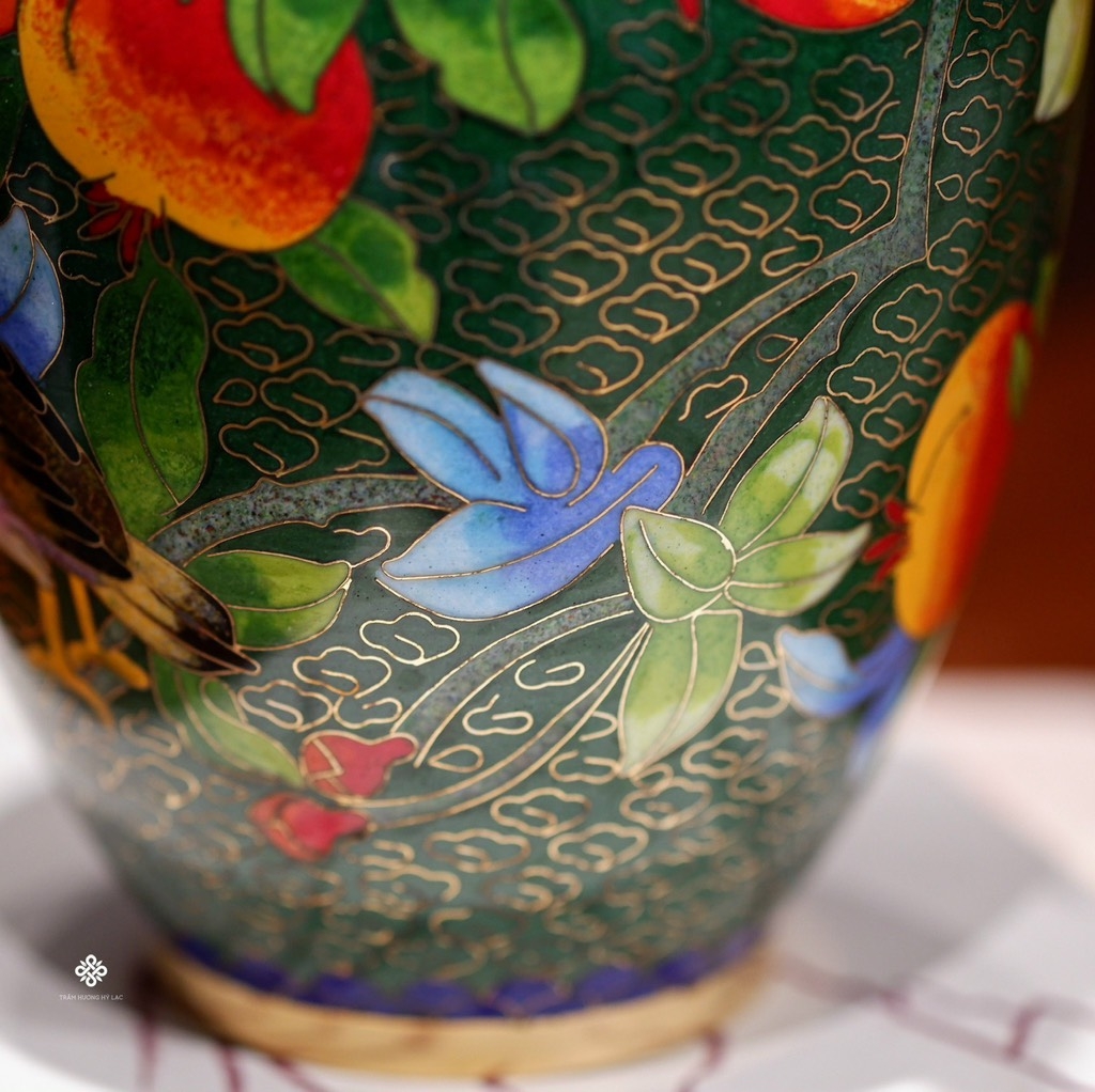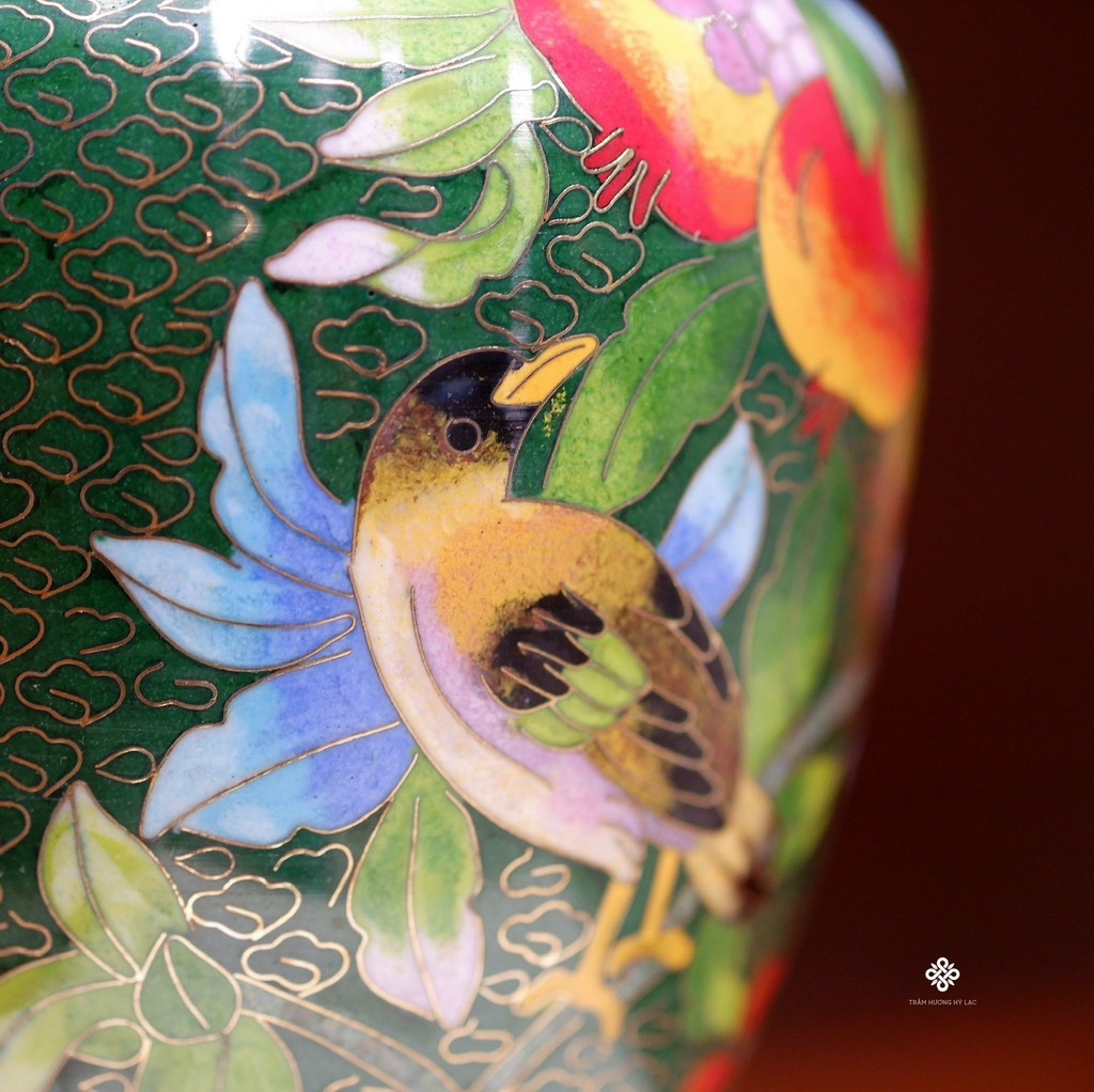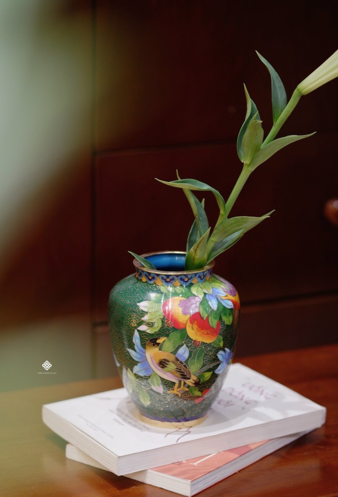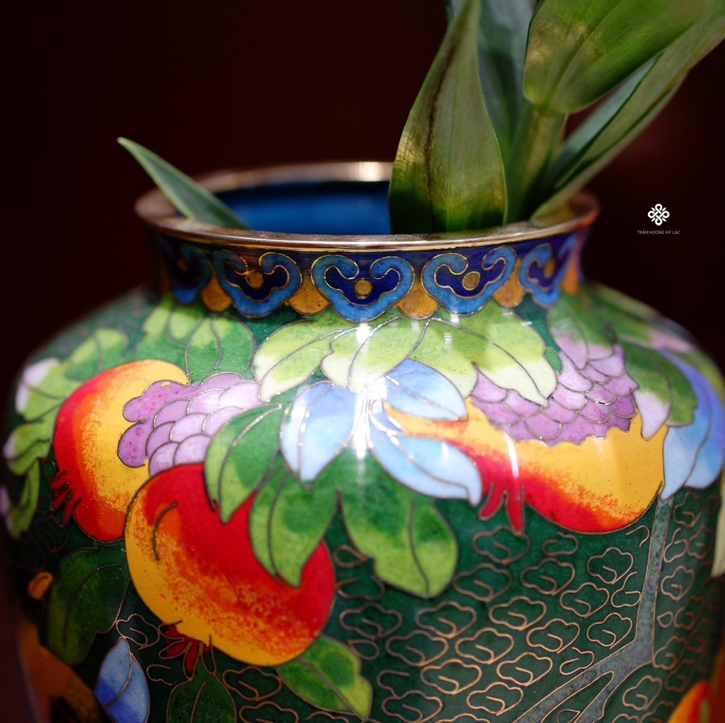 Thông tin chi tiết bình hoa: Chất liệu: đồng khảm pháp lam Chiều cao: 14cm Đường kính: 10.5cm Đường kính miệng bình: 6cm Cân nặng: 400gram Thông tin chi tiết đế bình: Chất liệu: gỗ Đường kính đế: 8cm Chiều cao đế: 3cm