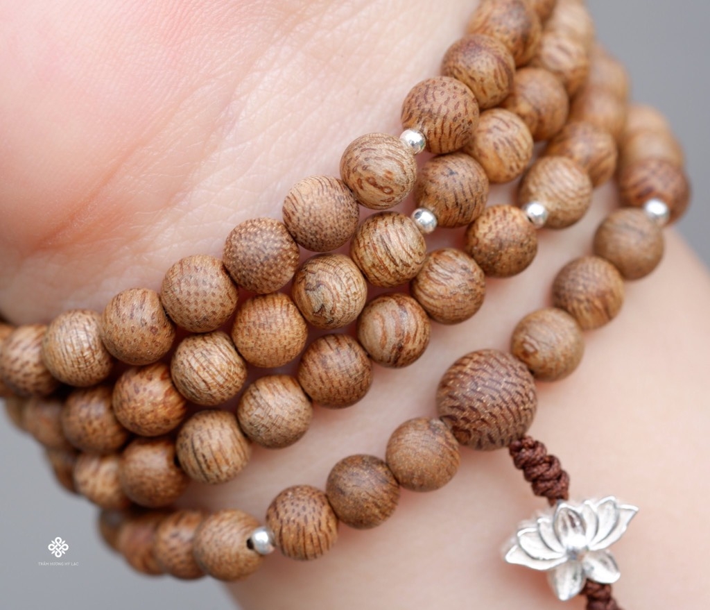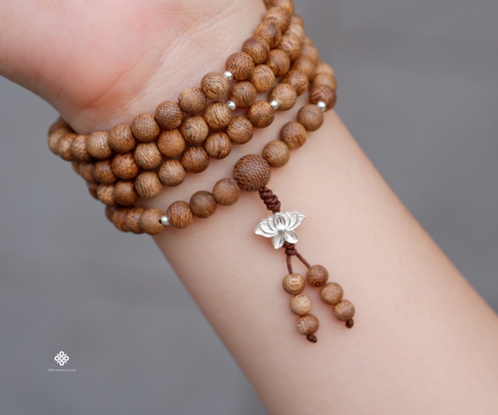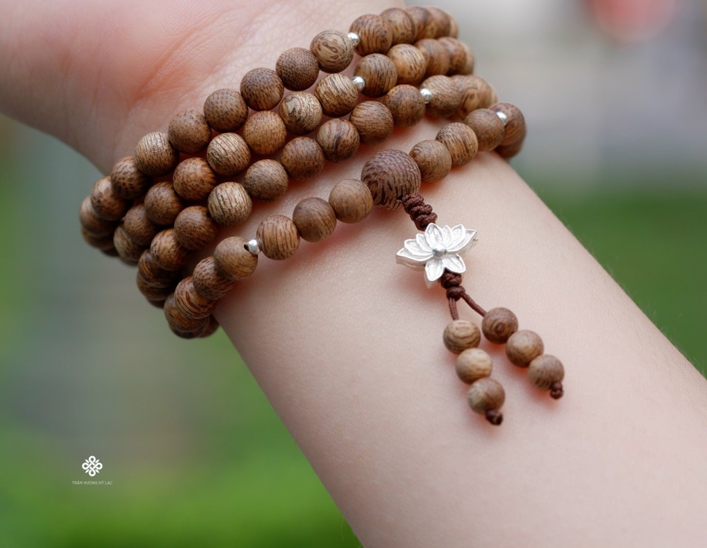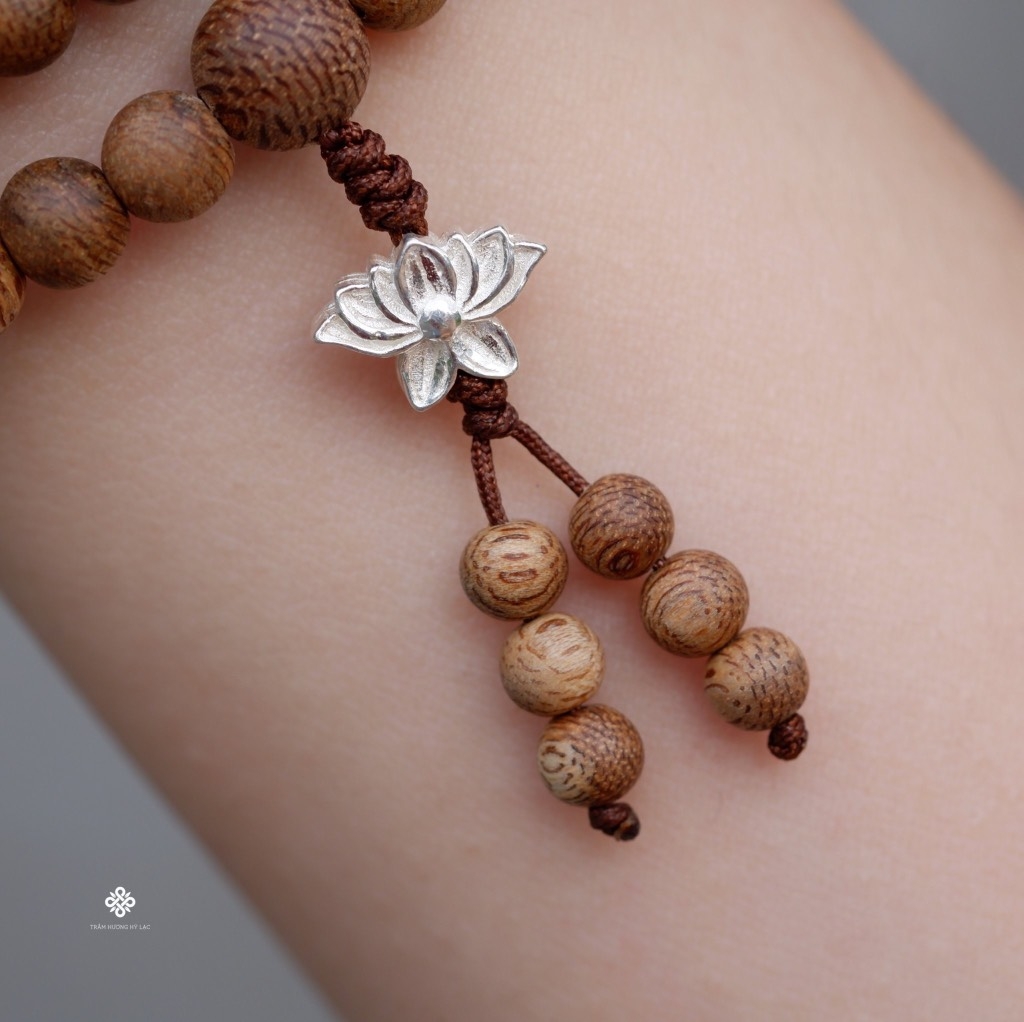 Chuỗi 108 hạt trầm rừng 6mm phối hoa sen bạc