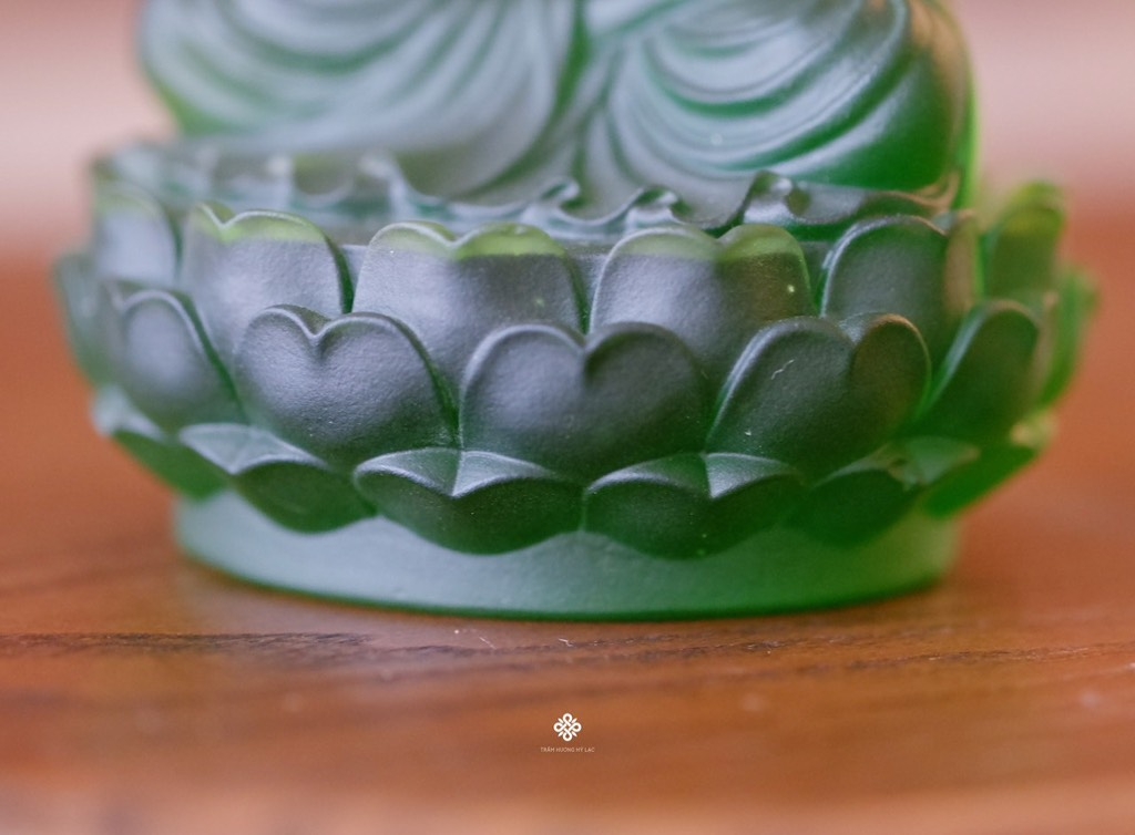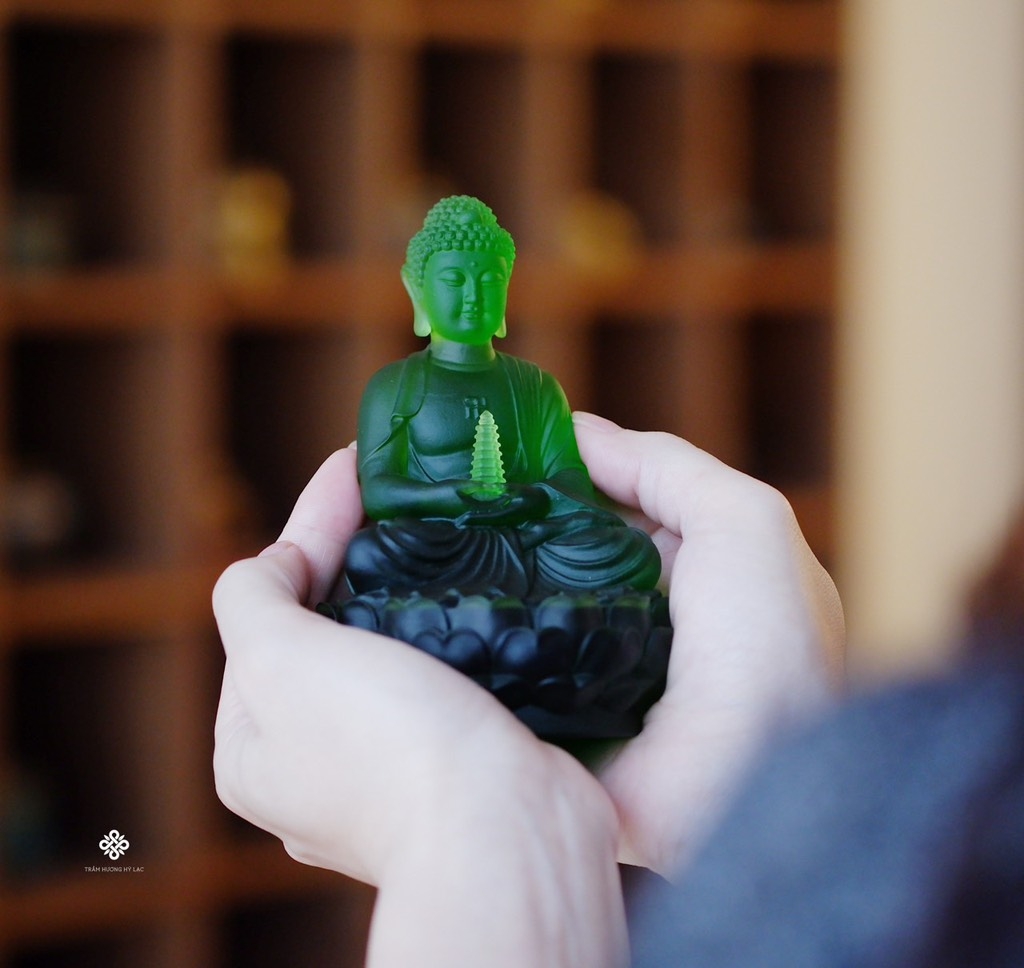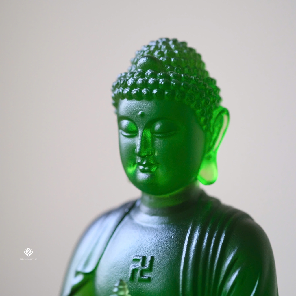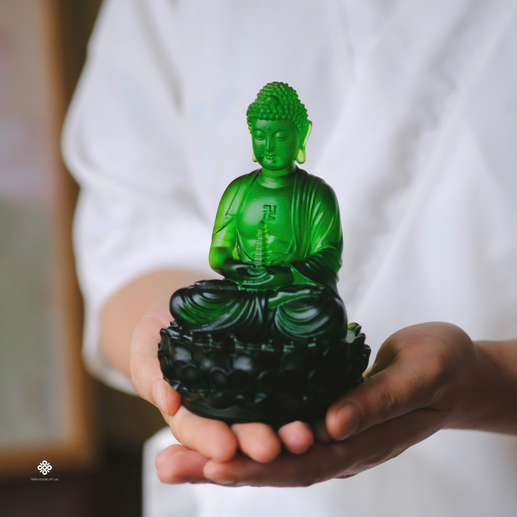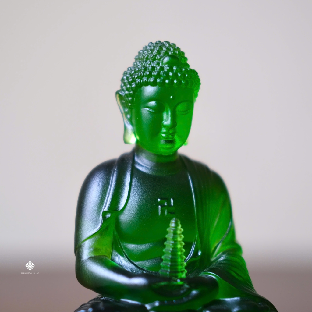 Tượng Đức Phật Dược Sư cầm bảo tháp lưu ly xanh lá 12.5cm
